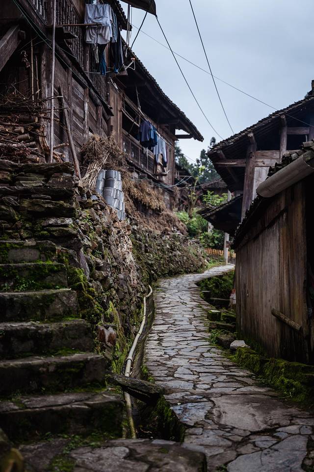 放完行李,我们就迫不及待出来逛寨子啦。由于今天天气不好,下着毛毛细雨,石板路还是湿的,游客也不多,让寨子更加静谧了。我挺喜欢这种氛围,如果不是为了拍照出门,在民宿里面听着雨滴落在青石板和屋顶的声音,一定也很安逸。