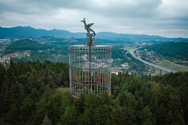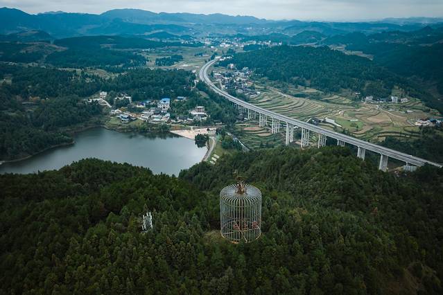 卡拉村是不需要门票的,在停车场下车,便能看见山顶上有一个大大的鸟笼,用无人机帮我们去看一看。在山下看的时候觉得这个鸟笼土土的,但是无人机拍出来竟然还不错。