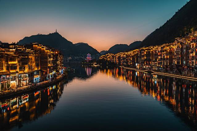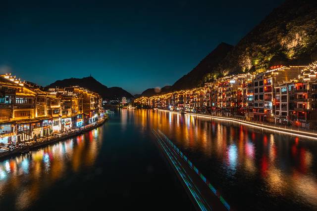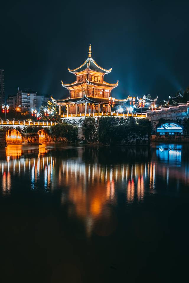 一座城,是镇远古城。远观古城,一半在山坡,一半入水中,舞阳河呈S型蜿蜒贯通全城,颇似一幅太极图。晚上河两边华灯初上,流光溢彩,古城夜空光辉而明亮。
