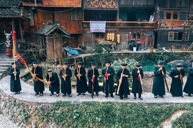 今天早上继续往东行驶,要去一个非常猎奇且有“观赏性”的苗寨,那就是岜沙苗寨(苗语念biā shā,意思是草木繁多的地方)。它被誉为“阳光下最后一个枪手部落”,至今佩戴着火枪(获得特别批准)。