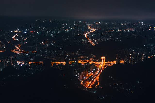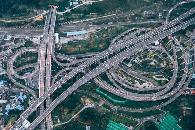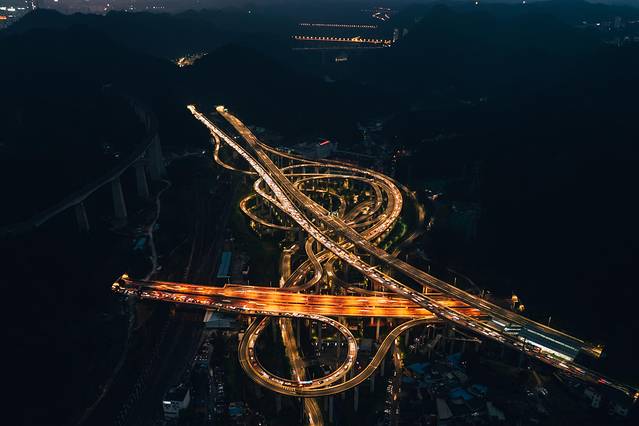 嗯?这介绍怎么那么熟悉?因为我今年6月去了重庆的黄桷湾立交桥,“黄桷湾立交桥是重庆最大、最复杂的立交桥,高达五层、共20条匝道,据说分分钟就会拐错弯,让人又爱又恨”。这样一对比,好像还是黄桷湾立交桥更复杂。但是因为黔春立交桥是用航拍拍的,所以更震撼。