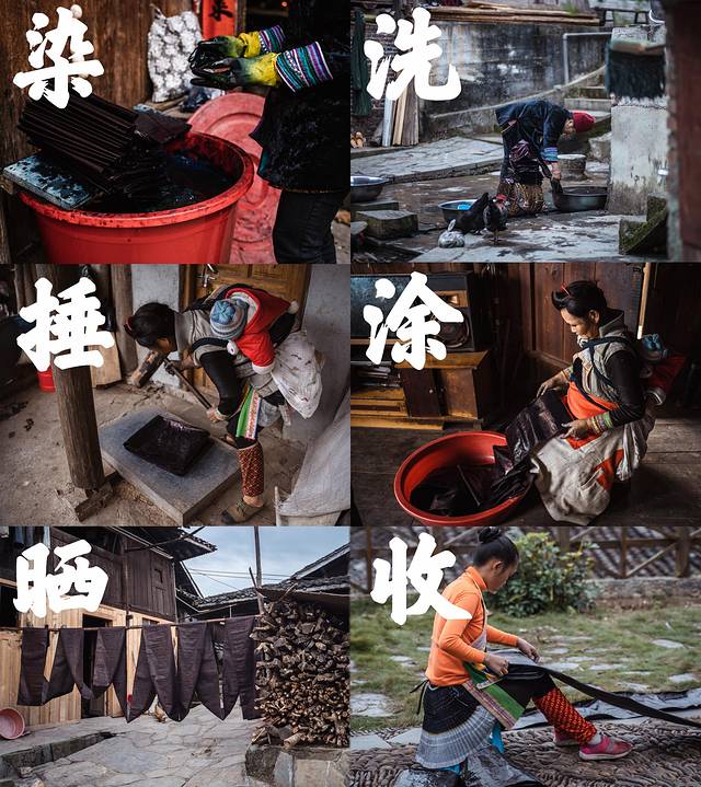 侗布非常结实耐穿,制作过程也很复杂,白布织好后,放在蓝靛染桶中浸泡除白,反复浸泡、晒干数次,布就成了青黛色。然后再用牛皮汁浸泡一次,布变成硬质。之后置于平板上捶打晾晒,反复涂抹蛋白液,继续漂、染、晾、捶,最后才算制成。蛋清涂抹和敲打是秘诀,太让人惊讶了,蛋清竟然还能做到衣服里面。