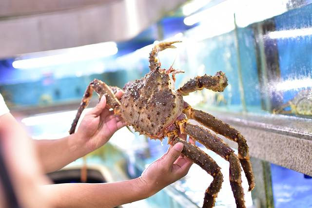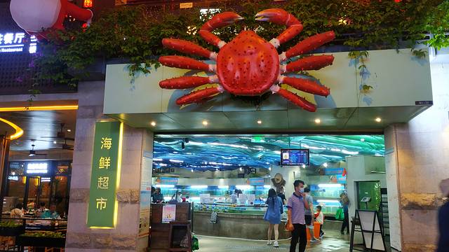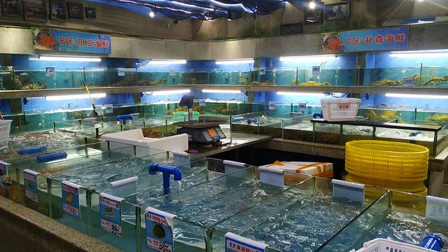 🐟这里有一间海鲜超市,有多种常见的和不常见的生猛海鲜,猛到咂舌!虾、蟹、鱼、龙虾,各种贝类,欢乐的在水里游泳,选好海鲜送到海鲜加工店加工,做法也相当丰富,咸蛋黄焗,避风塘炒,豆瓣酱炒,黑胡椒炒,白灼等等等等,一定可以找到自己最喜欢的口味。亲手提了一只大大的波士顿龙虾,两只大钳子相当有劲。