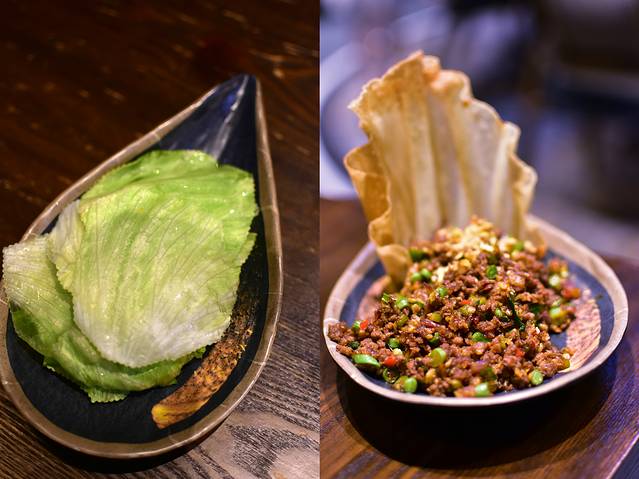 泰式碎牛肉生菜包/牛肉碎,这道菜和韩国菜M比较相似,但使用的圆生菜叶可是大小一致,码得整整齐齐,生菜也和牛肉碎各自单吃都不怎么好吃,但是用生菜叶包着牛肉碎再入口,那可就不一样了,清甜脆的生菜和干巴的牛肉碎相结合,入口咔嚓一声,在口中咀嚼,相互融合的味道堪称完美。