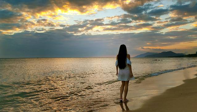 在夕阳沐浴下的海滩散步,感觉恬静又安逸,假期小确幸!