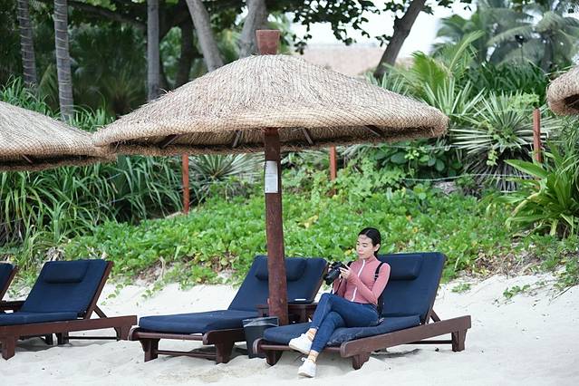 这边有一排长长的躺椅休息区,一个蘑菇伞草棚下有一对躺椅,最适合下午在这里消磨时光。