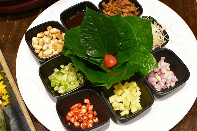 泰国北部小吃,这里一款用手抓的小吃,用鱼腥草叶子包起柠檬、腰果、小米辣、虾米干、洋葱、特制酱料等,一口吃,味道很棒,吃完之后,口里还有回甘,忍不住再做下一个继续,非常喜欢这款,这是第一次吃,我就喜欢上它了,隆重推荐给你们。