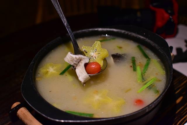 🍲海南酸豆锅底+🐟龙胆石斑鱼+🐠金古曼鱼,首先要点一个招牌酸鱼汤,选了两种鱼的搭配,口味更丰富,汤底里面放了杨桃和番茄,这样特别的搭配还是第一次吃到,鱼肉很嫩,鱼汤鲜美!