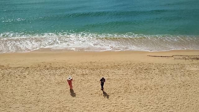 这是蓝白小镇海岸线的沙滩,中午和黄昏是两种色调,午间是蓝色的,傍晚是金色的,各有韵味。