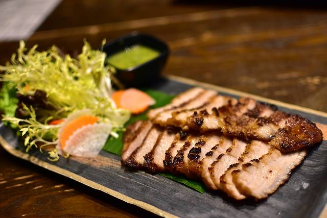 泰式明炉烧猪颈肉,肥瘦皆有的猪颈肉是我非常喜欢的食材,烧出来的真是香喷喷,肥而不腻,配上绿咖喱和蔬菜沙拉,一道泰式美味。
