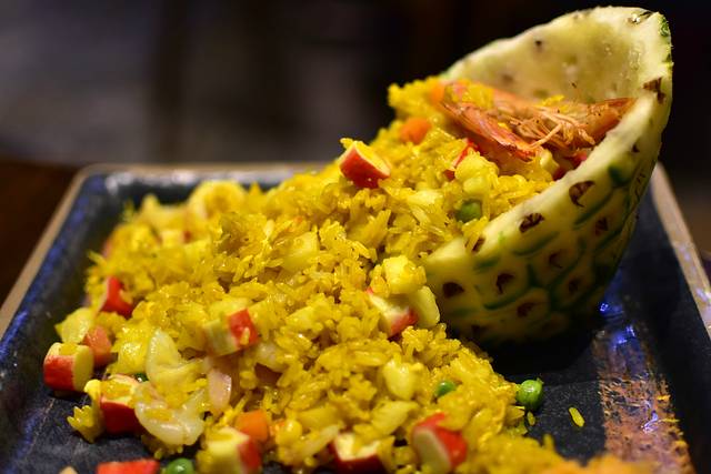 招牌菠萝海鲜炒饭,推荐点一个当主食,我一直都很中意吃菠萝海鲜炒饭,每一个元素都是我喜欢,酸酸甜甜的菠萝粒,美味的虾仁,加了咖喱的米饭,散散的一粒一粒的,好味道。