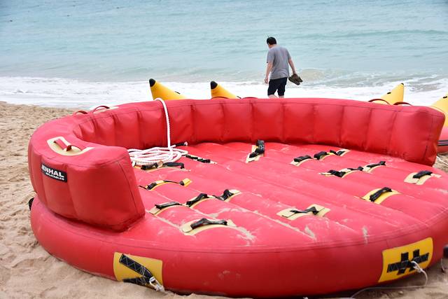 如果有好几个朋友一起,可以一起玩香蕉船,坐着香蕉船在蓝色的大海里驰骋,让海浪冲刷自己,能让心情马上high到极点,不坐不知道,坐了嗨到爆,所以不开心就要去坐香蕉船。