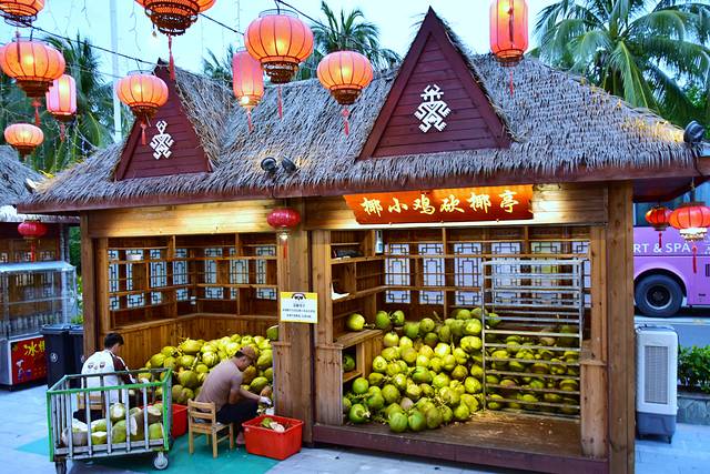 因为椰子鸡火锅需要消耗很多的椰子,一个锅底就得用掉三个大椰子,另外加上饮品,每日消耗大量的椰子数量很可观,所以专门设了一个亭子砍椰子,把叶子上面砍出一个洞洞,把椰汁倒出来,我个人觉得还是需要技术含量的,1需要力气大把椰子砍破,二腰保持椰子的稳定,不能让椰子倾斜,不然里面的椰汁荡出来会浪费。