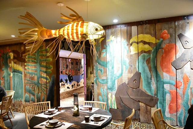 餐厅环境:首先,餐厅的环境很有氛围,温馨又有创意,实木木板贴墙,上面有一些海底世界的卡通手绘,这里最有创意的是吊灯了, 餐厅里安装了多个大大的金鱼吊灯,把餐厅的每一个角落都填满了暖暖的灯光,做旧的木圆桌,竹编的椅子,和餐厅的整体色调非常搭配,坐在这里吃饭,感觉特别放松。