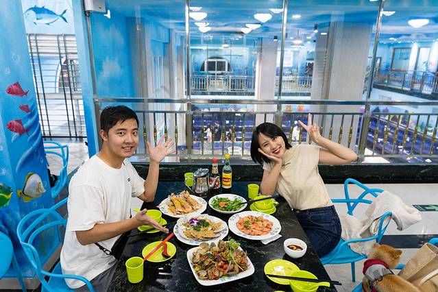 小海豚海鲜室内室外都是涂着蓝色的墙面装饰,非常有海洋的风格,进去一楼就是海鲜市场,可以选购新鲜的海鲜,在一楼选好海鲜了之后就可以去选座位啦,空间很大基本上不用担心没有座位,还有适合聚餐的包厢。服务态度整体都不错,店面很干净,桌上的垃圾看到了也会帮着及时的清理,并且结账的时候也会推荐使用相应的优惠券。