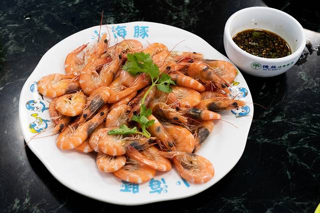 1)白灼基围虾:超大一份,肉质很鲜嫩,分量很足,真是多到我们四个人都没有吃完!蘸着蘸酱吃很好吃!