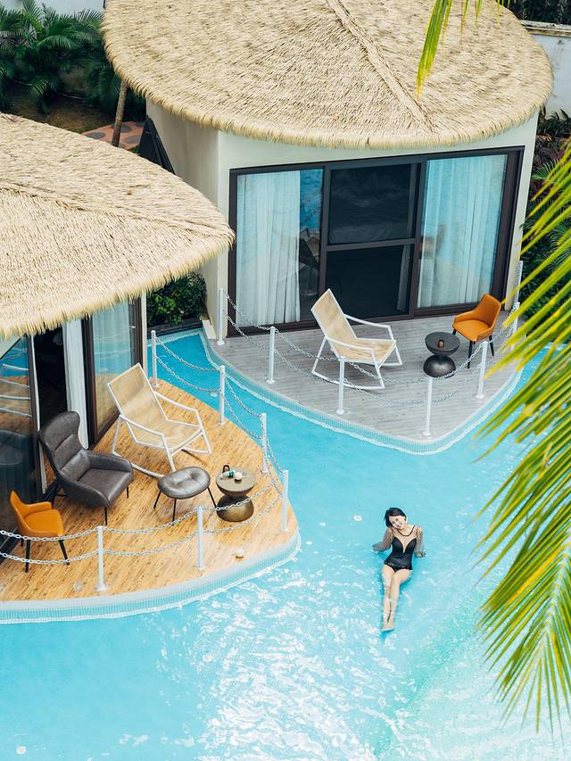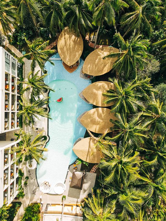 这家民宿无论是提前看攻略还是实际入住,都给了我非常棒的体验!非常之巴厘风!被椰树林围绕的泳池,还有泳池边的水上船屋都很好看!很有设计感,所以无人机拍出来的照片真的超好看!泳池水质很干净拍了照赶紧去游了两圈!