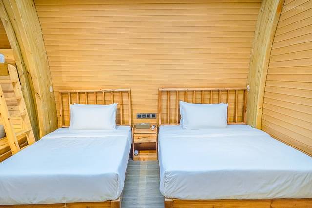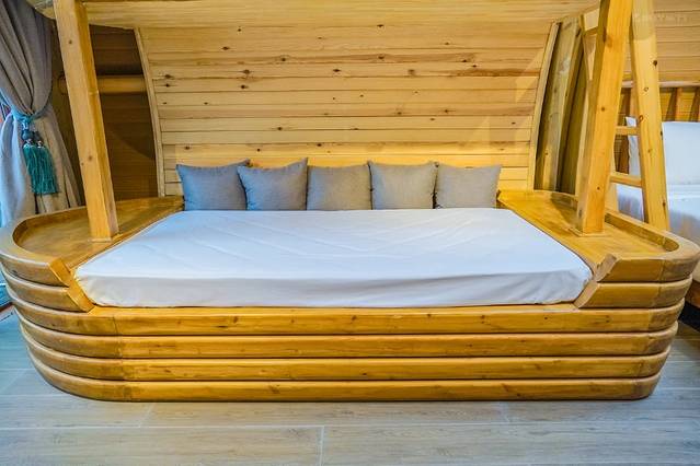 船屋空间比较大,住得下4个人(壮汉不建议,但很建议一家四口入住),有两张床,一个混沙发的上下床,有个天窗,不知道这算不算浪漫。