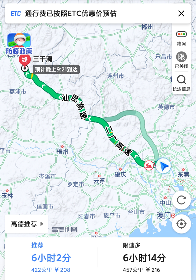 自驾从广州出发到三千漓的酒店,花费时间大约6h,要保证起码有两个人轮流开,防止疲劳驾驶。