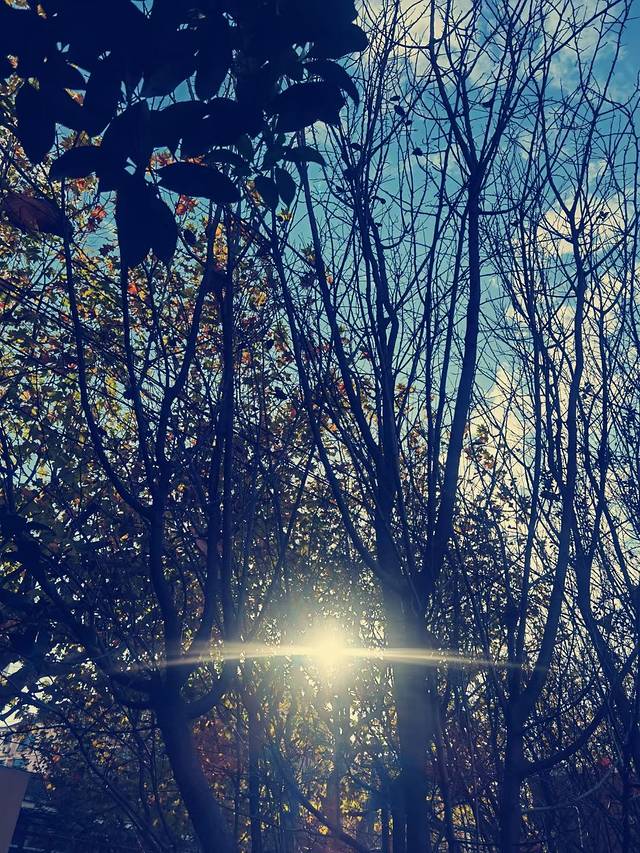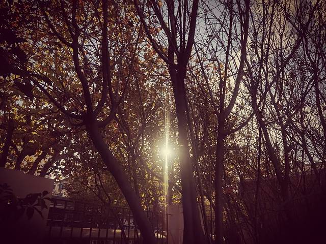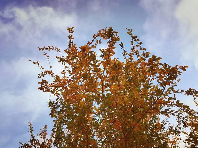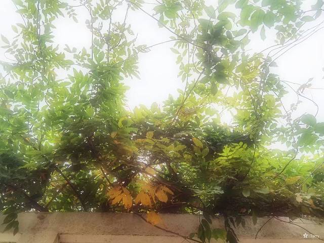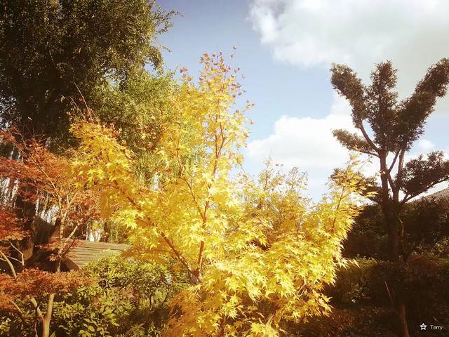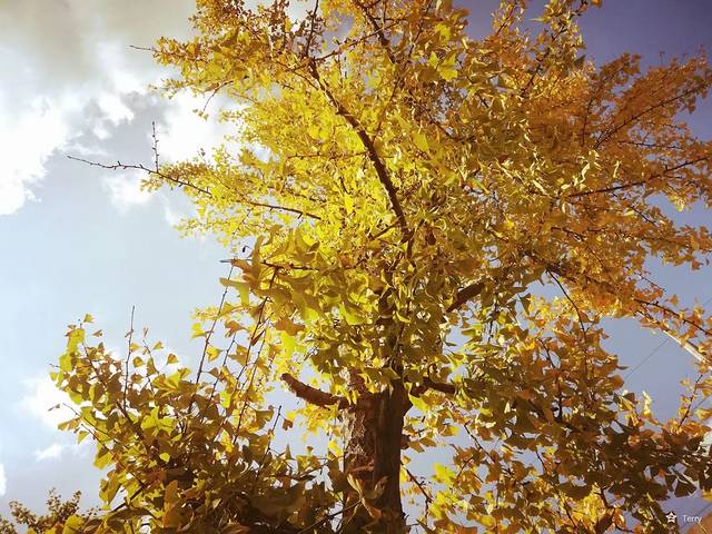 往年这个时候,古银杏都黄了,呈现出一幅满地尽铺黄金甲的优美画面,今年这棵古银杏一点都没动静,倒是周围的小银杏树都金灿灿、亮闪闪的,格外惹眼,周边秋韵浓浓的氛围,让人心醉。我都急死了,这棵古银杏倒是一点都不着急,唉!你快点黄吧。
