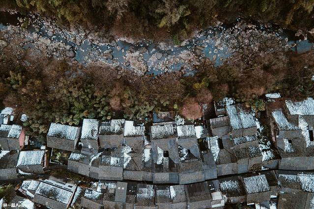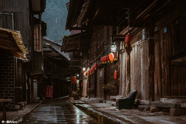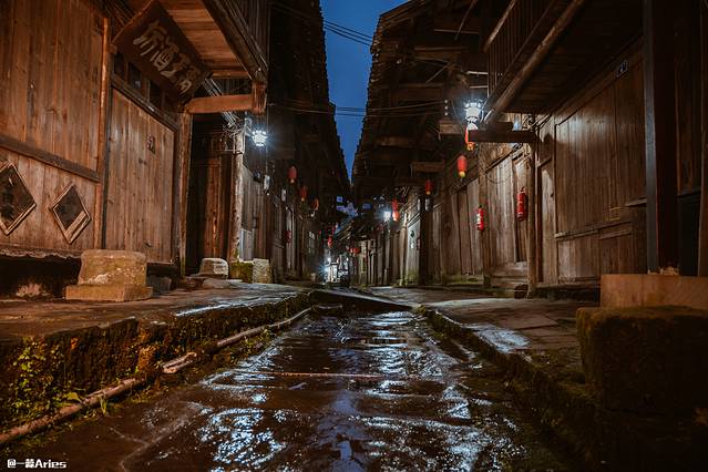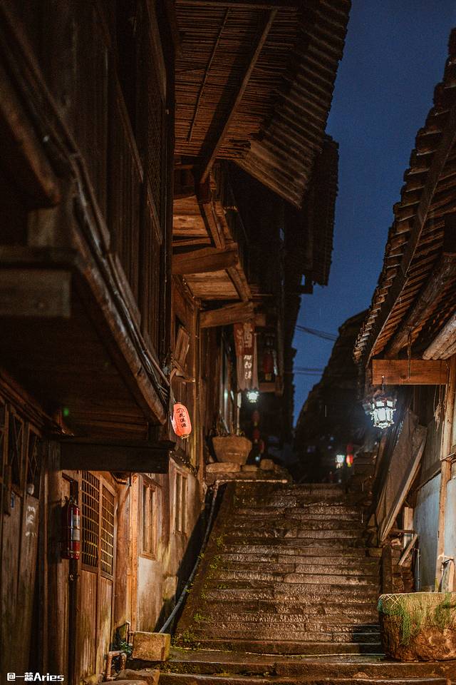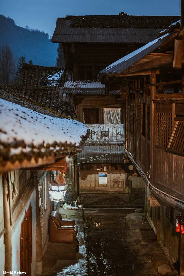 无人的街被暖暖的路灯照亮,屋檐上的降雪融化成水滴,将青石板晕染出厚重的光泽 ,不用钉子建造的干栏式木楼错落倾斜着,古色古香的窗格、匾额以及偶见的精美图案雕刻,幽长光滑的青石板路在瓦楞相接的老宅相拥下,透出一线幽蓝的天光。