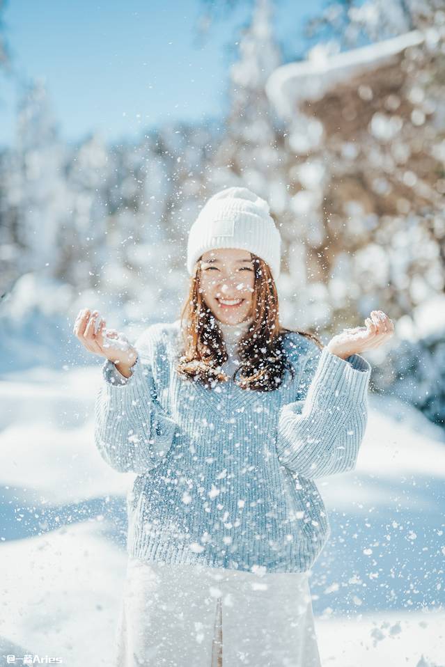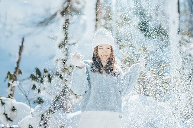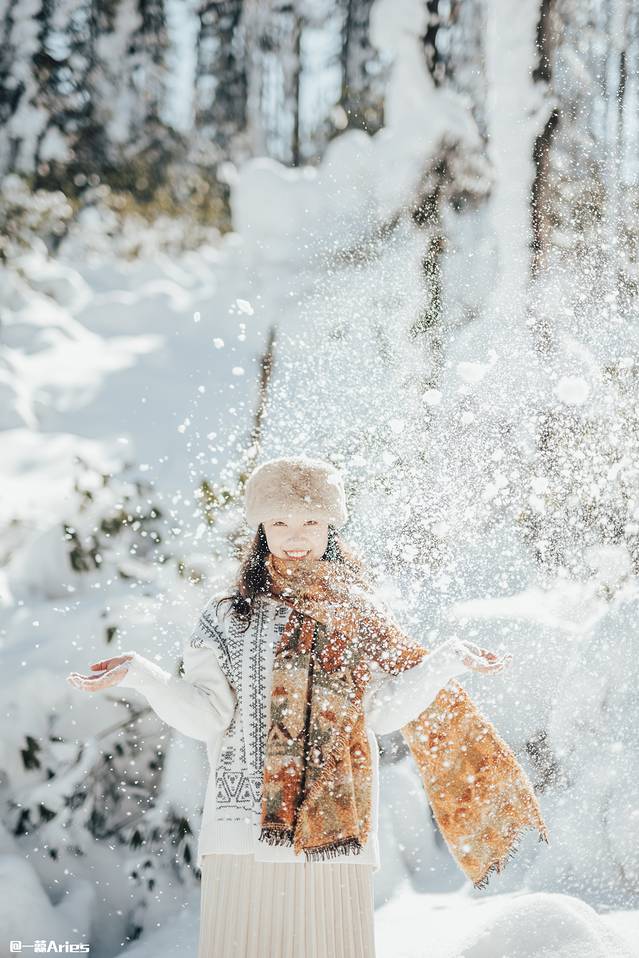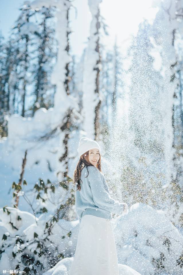 如果想制造一些氛围感,那么可以将粉雪捧起,抛洒至天空,在雪落下的瞬间抓拍,逆光条件下漫天飞舞的雪花被定格,这样的照片足以撩动人心。怕冷的话,记得戴手套玩哟!