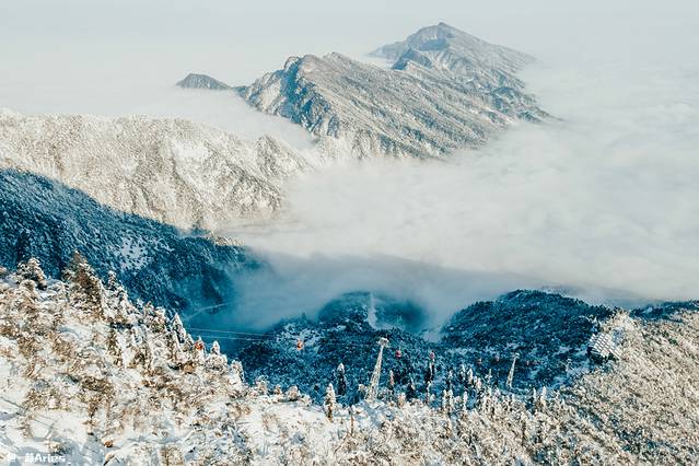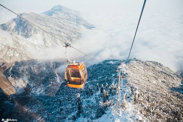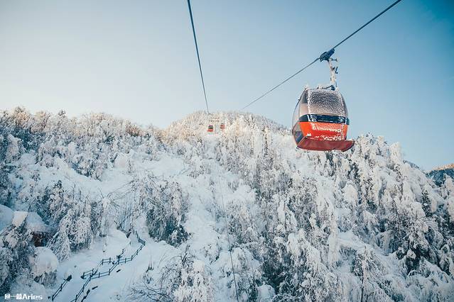 乘着索道一路上行,以最快的速度奔赴“人间天台 ”;穿梭天地间,白茫茫一片;如烟似雾的树挂静谧雅致,犹如被尘世遗忘的仙境。