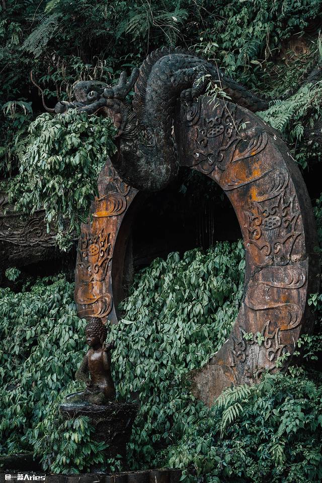 依山雕刻的九条长龙,真实再现了释迦牟尼佛祖出生的景象,被茂盛的植被覆盖,有点奇幻色彩。