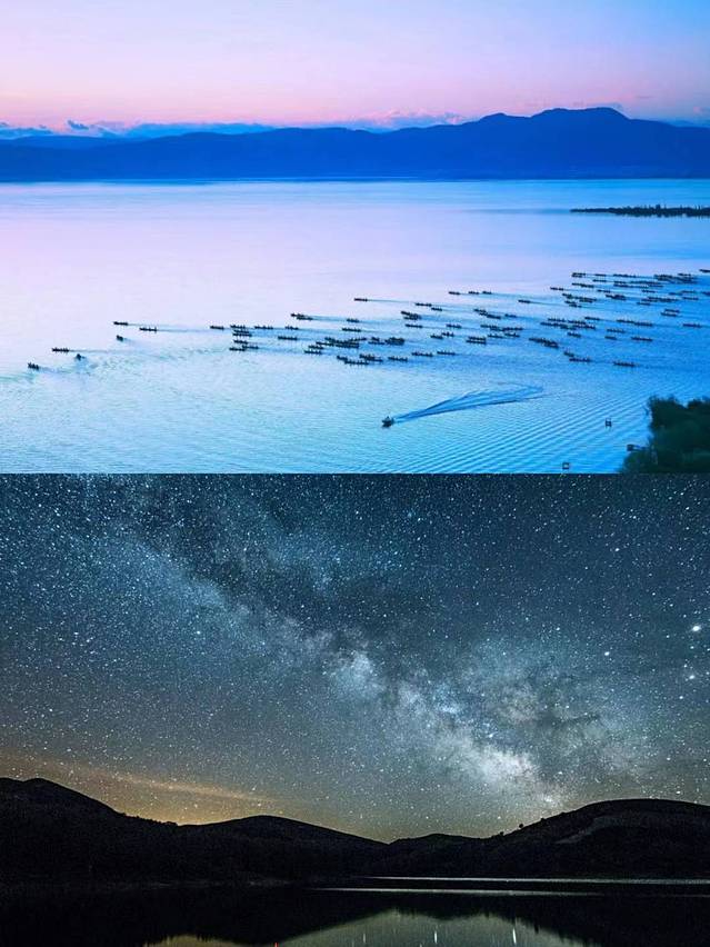 与抚仙湖仅有一山之格,却藏着另一番味道。摄影师们都爱来这里追寻一抹神秘的颜色——纯天然半蓝半橘色调,让人百看不厌。