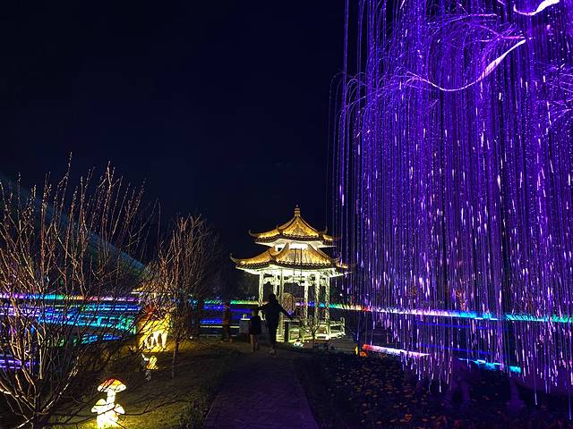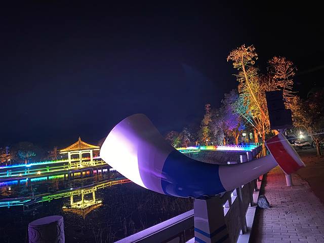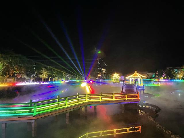 九曲桥上的灯光亮起,与湖上粼粼波光交相辉映,王子山之歌响彻耳旁,神秘感十足!