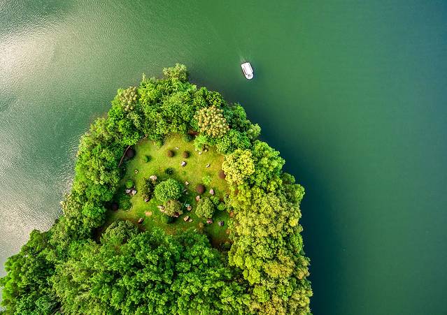 航拍器下盛夏的雁山湖,绿幽幽的,看着都遍体生凉。
