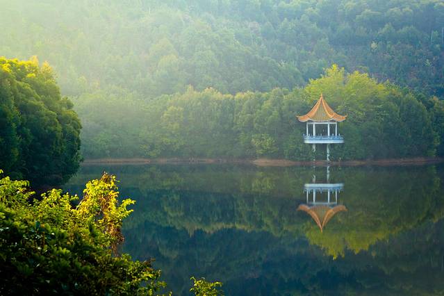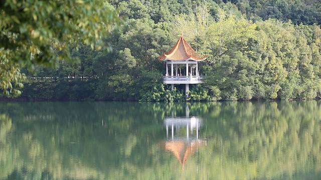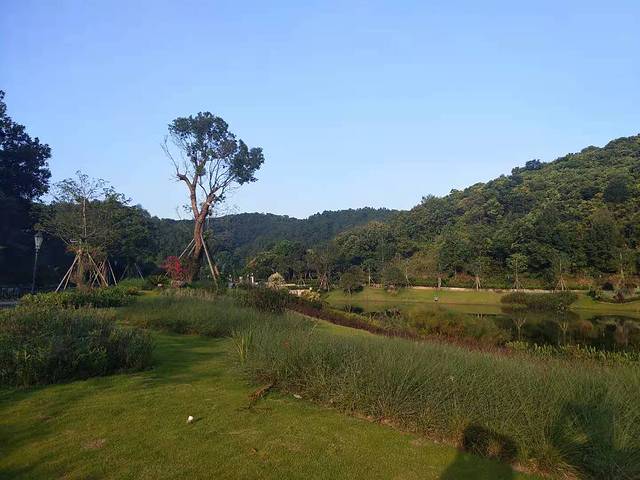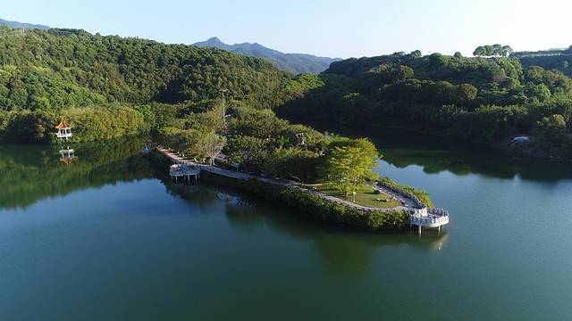 雁山湖在梅州梅县区,因为坐落在国家森林公园内,所以林木特别多,像个氧吧,空气很清新。