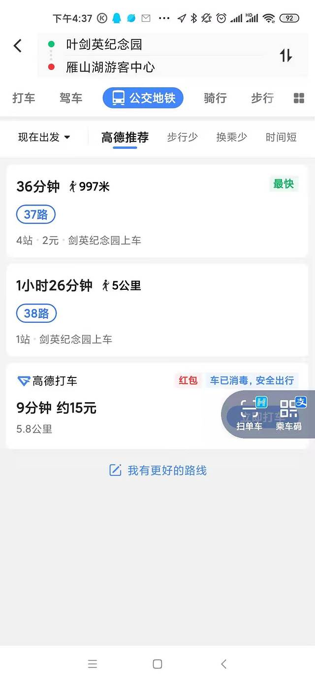 从叶剑英纪念馆到雁山湖速度就很快了,而且我查看了一下,还有直达的公交车。两段打车费用¥60。