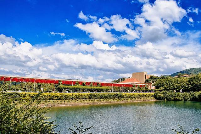 因为时值盛夏,我们一行几乎都在早晨、下午三点之后及晚上出来晃荡,这个城市的天空很蓝,雁山湖景区的林木花草也极多,每一张照片拍出来都是一种享受。