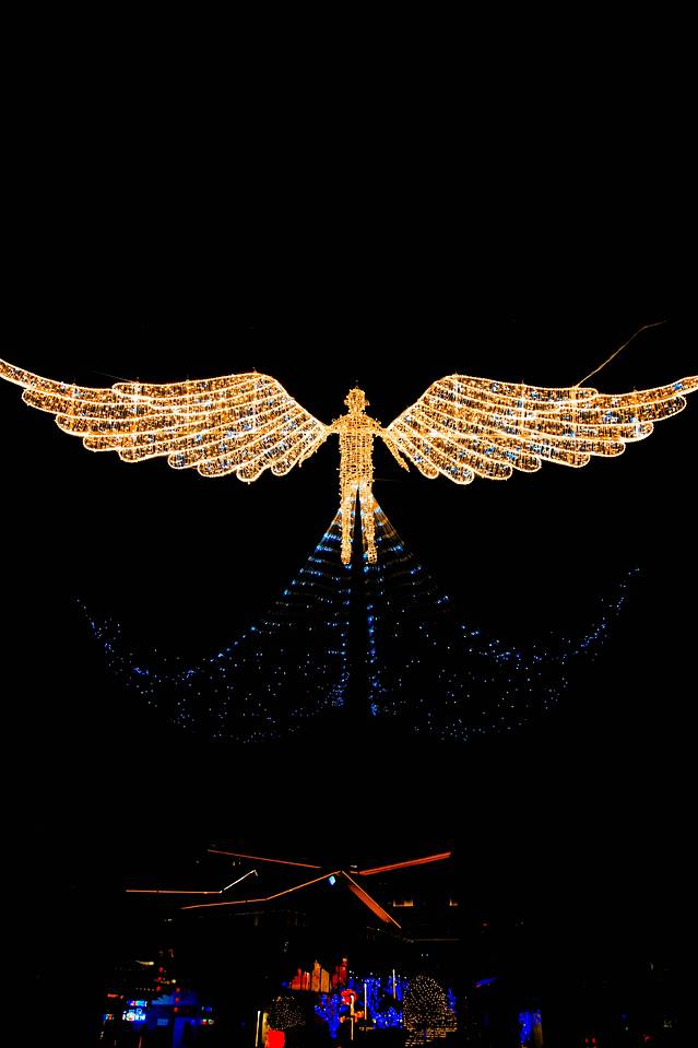 广场内设置了不少拍照打卡点,上次看到的那只位于大阶梯处的X眼黄兔子现在多了几个胖版的,趴着的斜着的坐着的都有,还挺萌,街区上空还吊了一个天使,我跟同伴盯着这个天使笑了大半天。