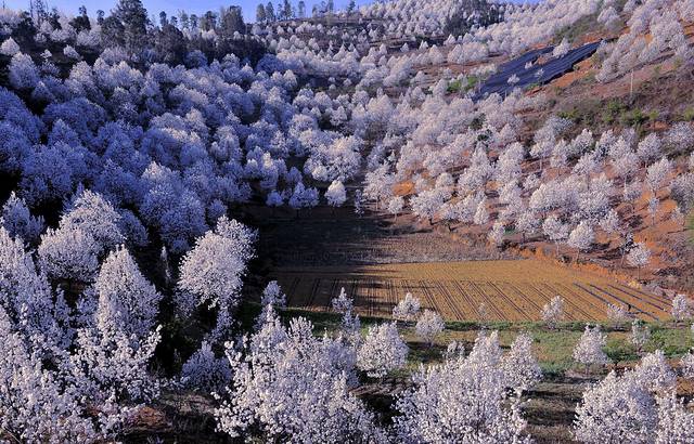 这个地方有着万亩多的梨花竞相开放,从远处或者是从高空中注视这里好像是一个雪山,风吹过的时候就像飘起的雪花一样,若不是会有淡淡的香味可能都忘记了这是梨花。走在梨花树下,向上望就能看见梨花了,踩着地面上的梨花一路向前。