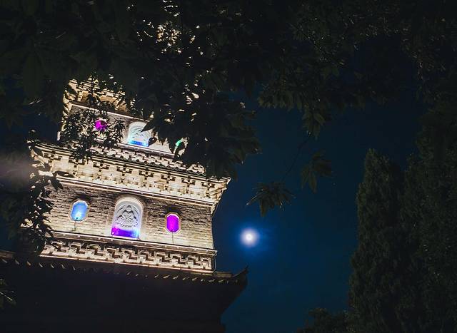 夜幕降临,我们决定去夜访梁飞塔,梁妃塔耸立于赤城山顶,四面七级,似一柄利剑直刺苍穹,昂然与云霞相吞吐,蔚为壮观。