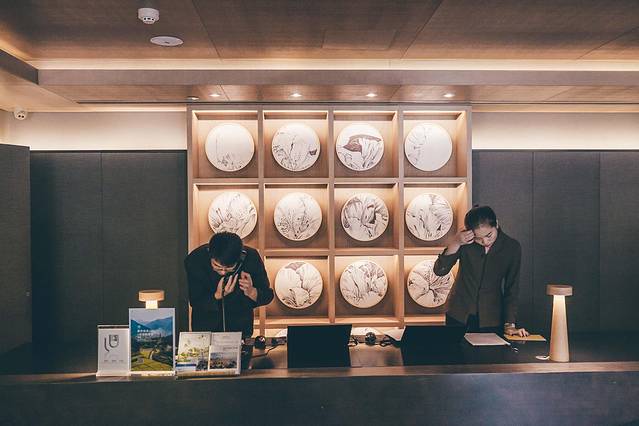 酒店设计团队是G20国宴设计团队,曾经把杭州西湖的风景融入国宴而惊艳世人,如今又很好的把天台当地的风景与文化融入庐境酒店内。比如酒店的艺术品装置就以天台县盛产的华顶杜鹃为主要设计元素。电梯和房间号的指引牌都是用毛笔手写字体书写。连电梯间内的麻织布板和装饰画都别有意境。