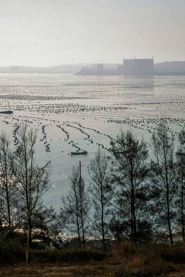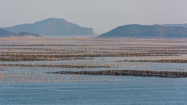 所谓的滩涂,是指在退潮后露出来的那些个类似泥塘的东东,而照片上插着的那些杆杆,则是当地渔民种在那的一些海产品。两个杆子之间拉着的绳子或者网之类的东西,插入海中,在上面种上紫菜、海带等待海产品,规模大了。变成了这般模样。霞浦的滩涂亦是一个日出的机位,当地的小伙伴开玩笑说,这里的每一家民宿都带有叫起床服务,想要看到照片里那种海水褪去,刚刚升出的太阳照亮滩涂的画面的小伙伴估计是难免干一趟早,而对我们这此的佛性旅行,看看日落,看看夕阳余晖里的种满海产品的海滩也就足够了。