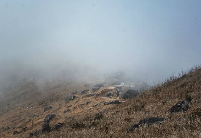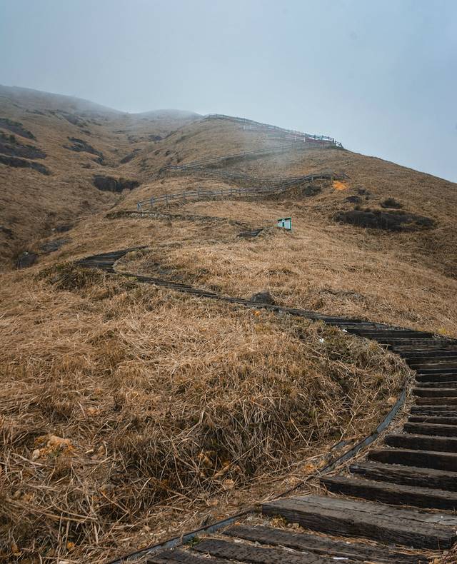 草场一直到山顶都修有木楼梯,以及很多人踩出来的小路,登顶的话也不算太困难,不过山顶的海拔较高,就很经常插到云里面去,温度降低得比较明显,已经视野会变得比较差,倒也有几分的仙气。