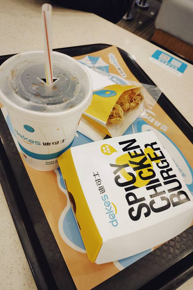 通过当地朋友介绍,作为各大奇奇怪怪的本地汉堡店,迪可士曾一度战胜德克士,开遍漳州城区。出于好奇我们还特意去试了一下,菜单普通、也没有太多花里胡哨的新品,唯一出奇的就是它的味道和十多年前麦当劳和肯德基的香辣鸡腿堡的味道几乎一模一样,特别有记忆当中的味道。(应该不是只有我一个人觉得现在的麦当劳和肯德基味道和以前不大一样吧,虽然也说不出是变好还是变坏了)