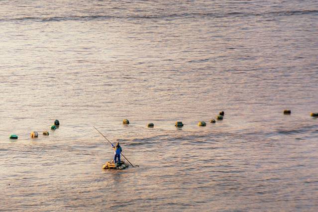 不同于带游客游玩的船,当地渔民在海上工作时乘坐的大多还是小竹筏,撑着竹竿穿梭在一片片海上农田里。渔民还会利用泡沫等材料制作简易的浮标以方便在茫茫的大海里找出自己的一亩三分地。