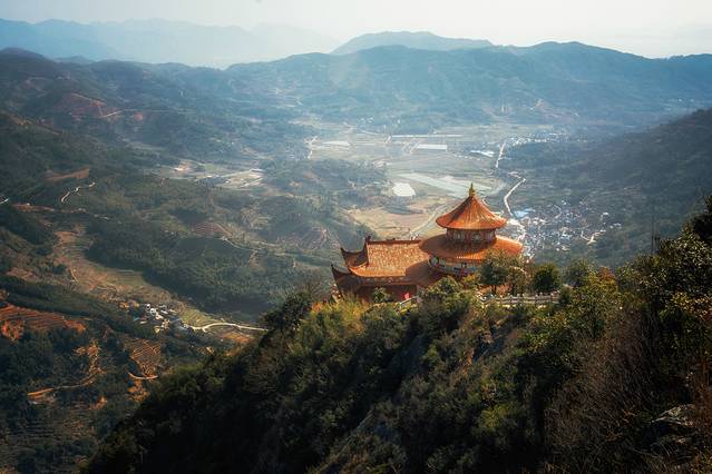 寺庙上的视野很开阔,可以看见到处都是山山山的福建的丘陵地形,以及四通八达的穿梭在一个个村落之间的乡道和被开垦出来的一片片农田。