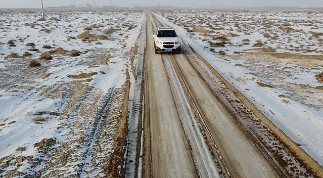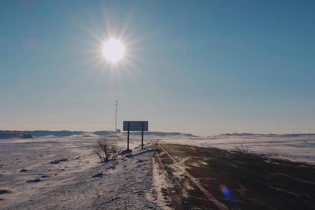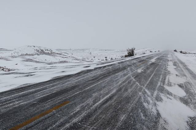 雪被风吹着飘过公路,沙沙作响。像是不会散开且有方向的烟雾,但是比烟雾更厚重,又像是白色的细沙,紧紧贴着路面被风吹着走。