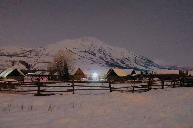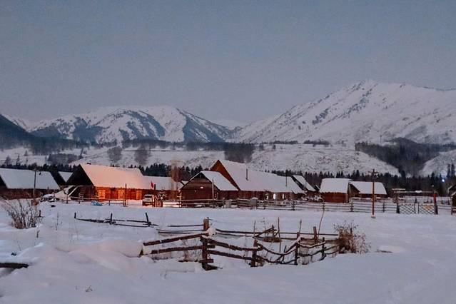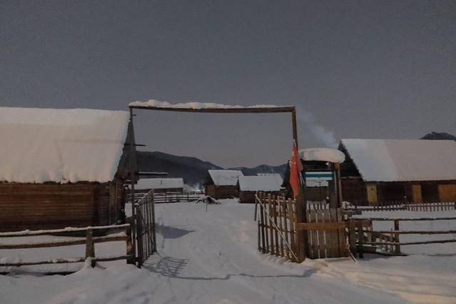 来到禾木天色已经完全黑了。我想如果在傍晚来的话,各家民宿暖黄色的灯开着,可能看起来就像是哈尔滨的雪乡吧。