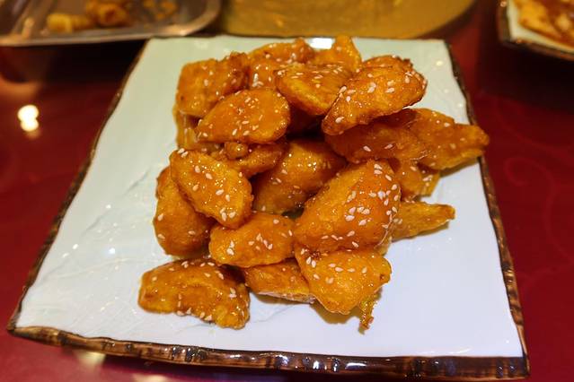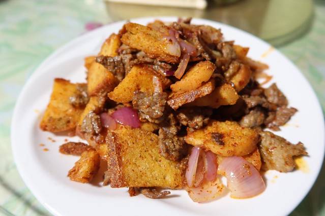 3、拔丝红薯:虽然不是新疆菜,但是真的非常好吃。蘸冷水再送入口中,外表酥脆的糖霜搭配内里软糯的红薯,一个字:绝!