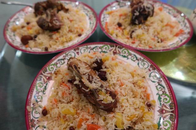 手抓饭是用羊排蒸出来的,搭配鲜甜的黄萝卜,胡萝卜,葡萄干,杏干,非常的吊人胃口。