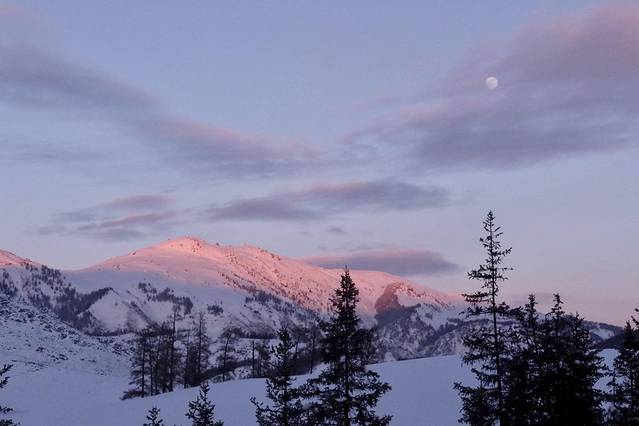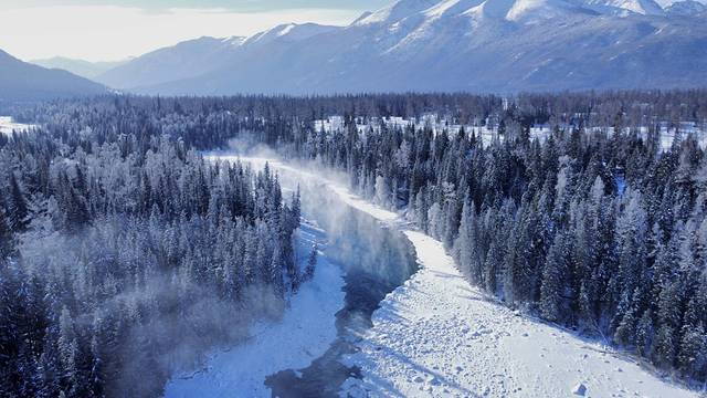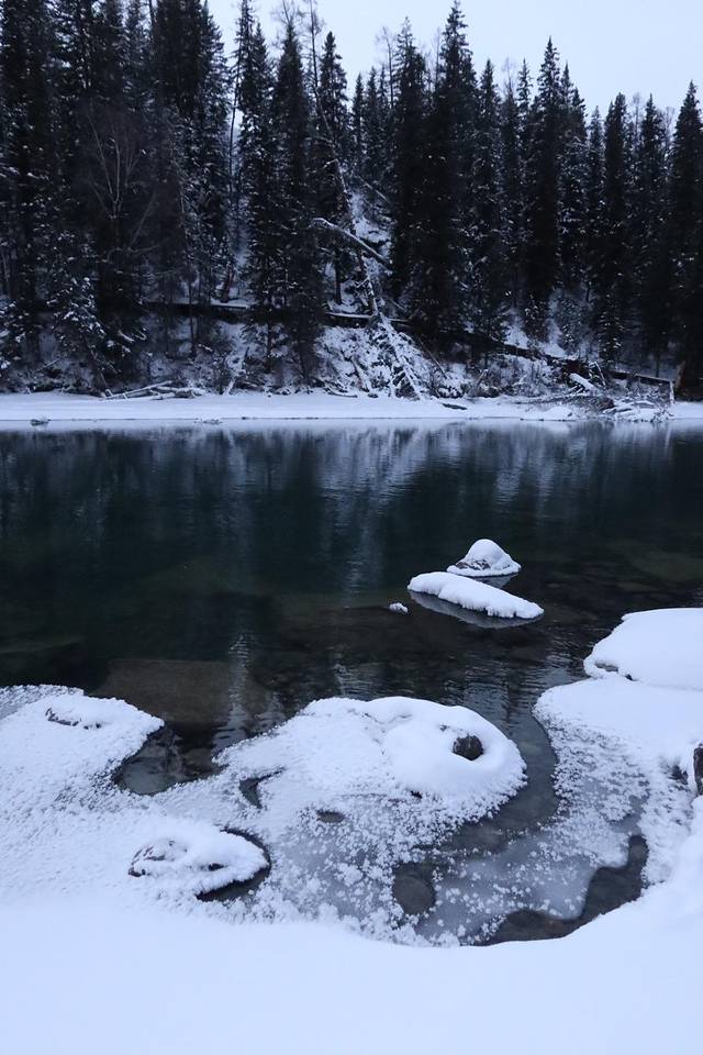 后面深一脚浅一脚的走去观景台,整个天空是暗青色,小狗兴冲冲的在前方带路。过了禾木桥,几个男子手窝在袖筒里围站着,见我们走去说160块钱一个人,我以为是要收门票,心想没有听说有收费啊,不吭声往前走几步,他们松口说100块钱一个人,我才知道是收费坐马拉犁送你上去的。一向自认为体格好的我断然拒绝。