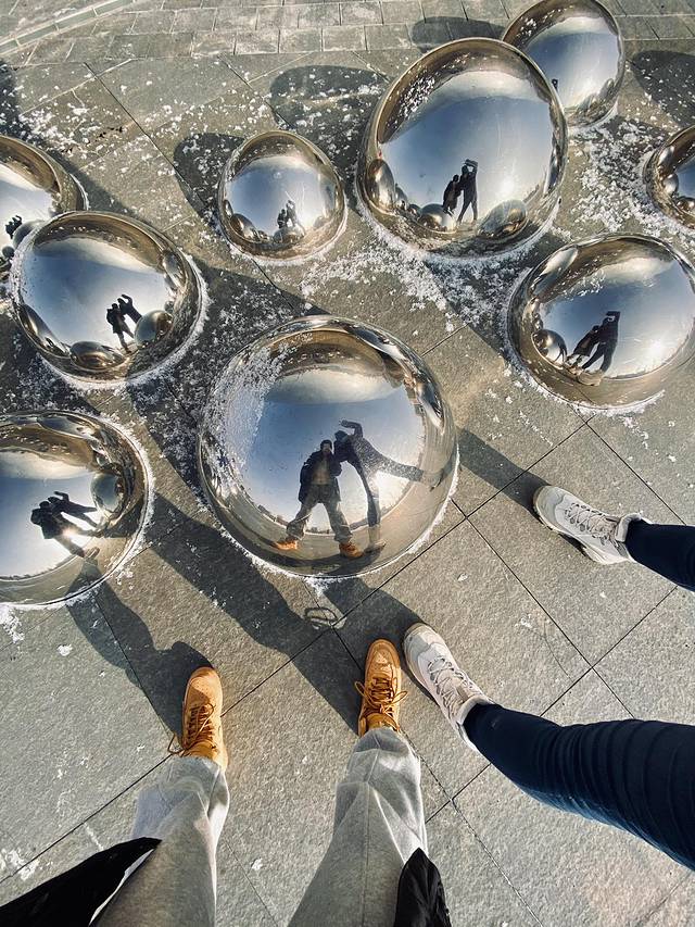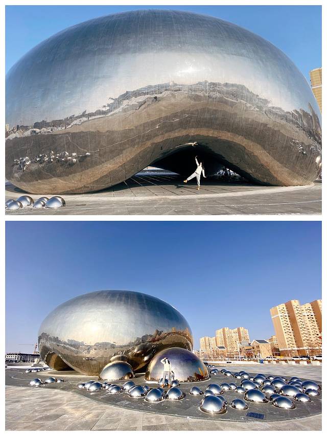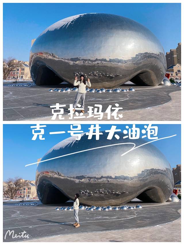 克拉玛依大油泡雕塑位于克一号井景区石油纪念广场,其设计灵感来自于黑油山油池中源源不断溢出的油泡,现在已经是克拉玛依地标性雕塑了。广场有免费停车场,除我们之外没有其他人了。这个雕塑是不锈钢材质的,看起来现代感十足。
