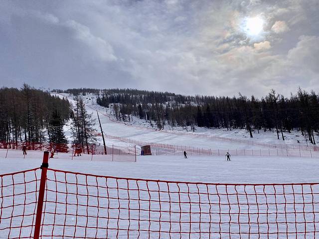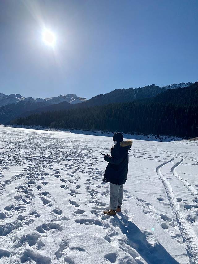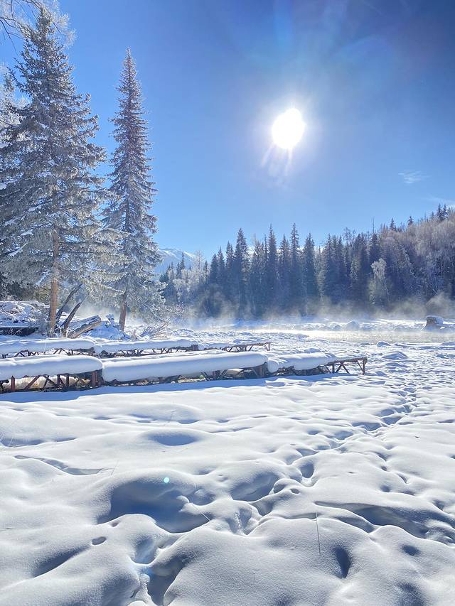 坐上观光车,一车的人都带着专业的滑雪装备,我心底里纳闷儿,🤔心想可能只有我们几个人是来看冬天的可可托海风景的。结果下车后傻眼了,分明就是只有滑雪场而已。大家想着不能白来一场,滑就滑吧。买门票,租雪具,租了头盔,算下来是150元/人。